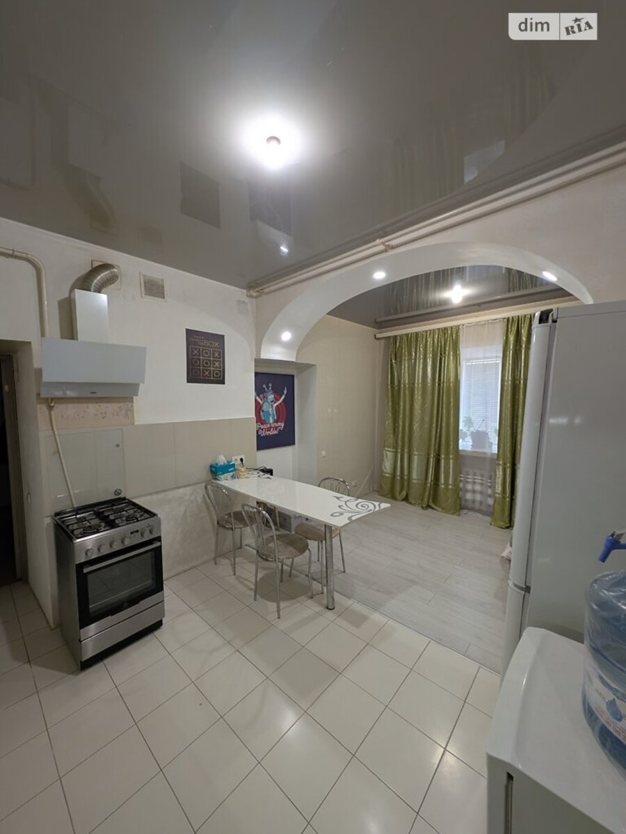 Кухня-студія сучасна, з плиткою та арочним проходом у зону відпочинку. Є обідній стіл, газова плита, витяжка, холодильник, диван. Багато місця та світла.