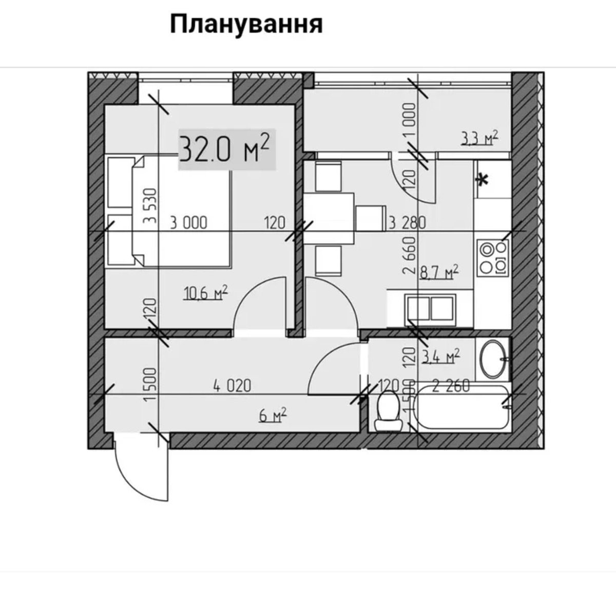 | Площа: | 32 / - / 12 м2 |